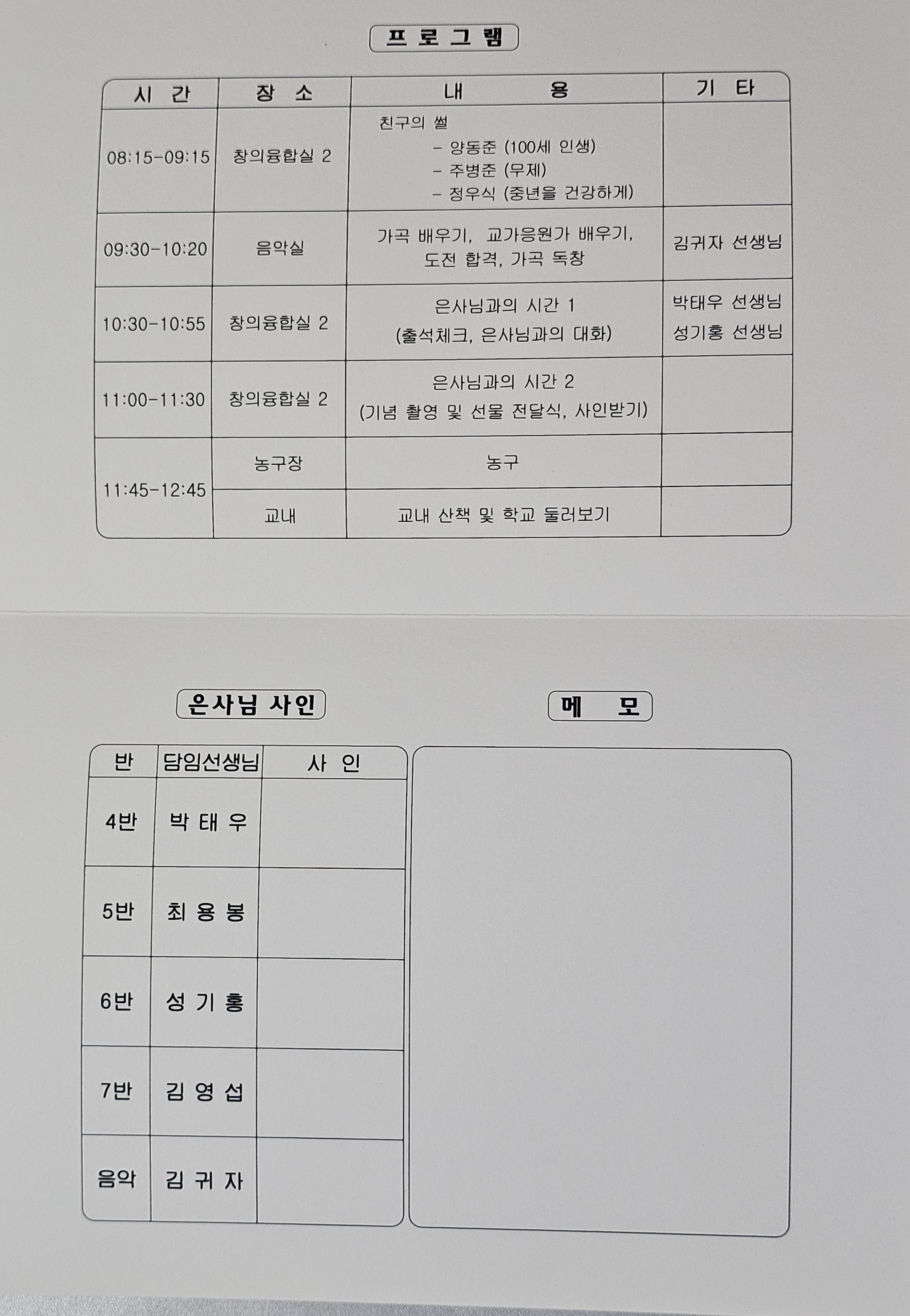 그래서 추억의 시절로 돌아가 고교시절의 하루를 재현해보는 프로그램을 기획하게 됐는데 나눠준 프로그램엔 여느 식순과는 다르게 6교시의 시간표와 은사님들의 사인란이 들어있다.